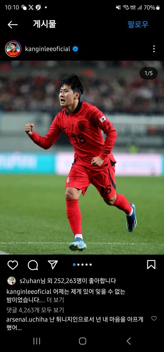 (엑스포츠뉴스 나승우 기자) 대한민국 대표로 A매치 1·2호골을 신고한 이강인이 응원을 보내준 모든 이들에게 감사 인사를 올렸다.