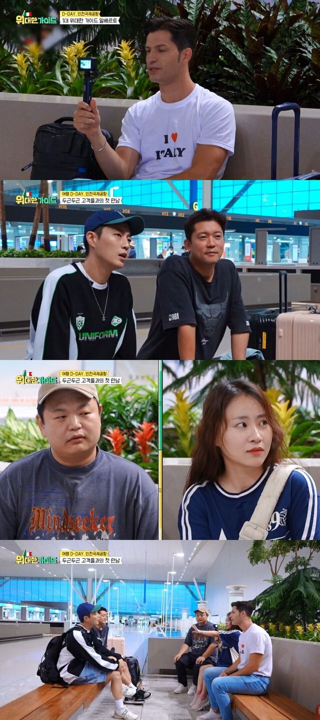 '위대한 가이드' 1회에서는 고규필, 김대호, 윤두준, 조현아, 알베르토 몬디의 첫 만남이 그려진다. 여행의 출발지인 인천공항에서 처음 대면한 이들은 다소 어색하지만, 설레는 모습으로 위대한 여정의 시작을 함께한다.
