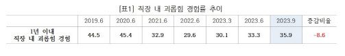시민단체 직장갑질119는 여론조사 전문기관인 ‘엠브레인 퍼블릭’에 의뢰해 지난달 4일부터 11일까지 직장인 1000명을 대상으로 설문조사를 실시한 결과 직장인 35.9%(359명)가 ‘최근 1년 내 괴롭힘을 당했다’고 응답했다는 결과를 15일 발표했다. 이는 직장 내 괴롭힘 금지법 시행 전인 2019년 6월 당시 실태조사 결과(44.5%)보다는 낮은 수준이다. 그러나 분기별로 살펴보면 △2022년 6월 29.6% △2023년 3월 30.1% △2023년 6월 33.3% 등으로 점차 늘어나는 추세를 보이고 있다.