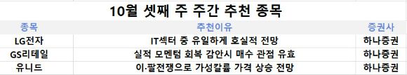 15일 금융투자업계에 따르면 하나증권은 이번주 추천 종목으로 LG전자, GS리테일, 유니드를 꼽았다.