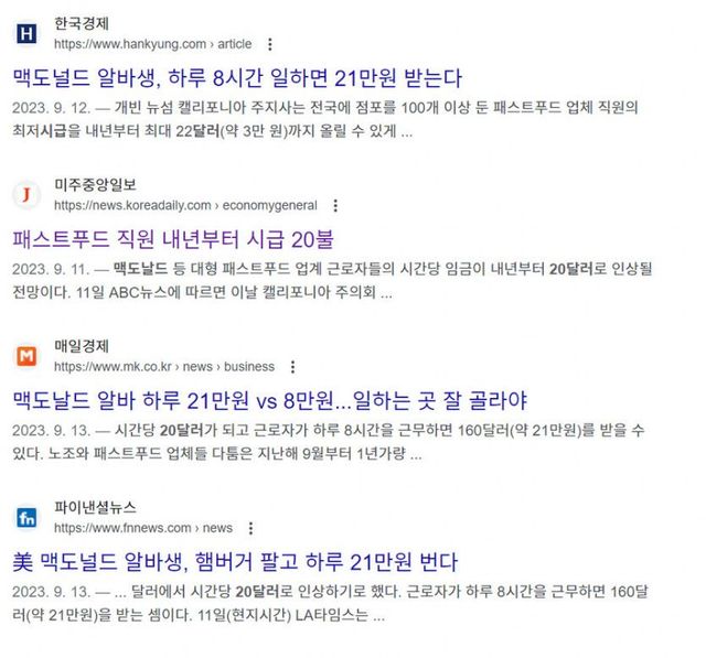 캘리포니아가 내년 부터 패스트푸드 알바 시급 20달러로 인상하기로함.