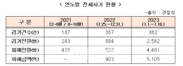 전세사기 검거 건수와 검거 인원도 급격하게 증가했다. 올해 7월 16일까지 검거 건수는 862건, 검거인원은 2582명으로 나타났다. 지난해 하반기에는 각각 387건, 884명을 기록했다. 검거 건수는 2배, 검거인원은 3배를 웃돌았다.