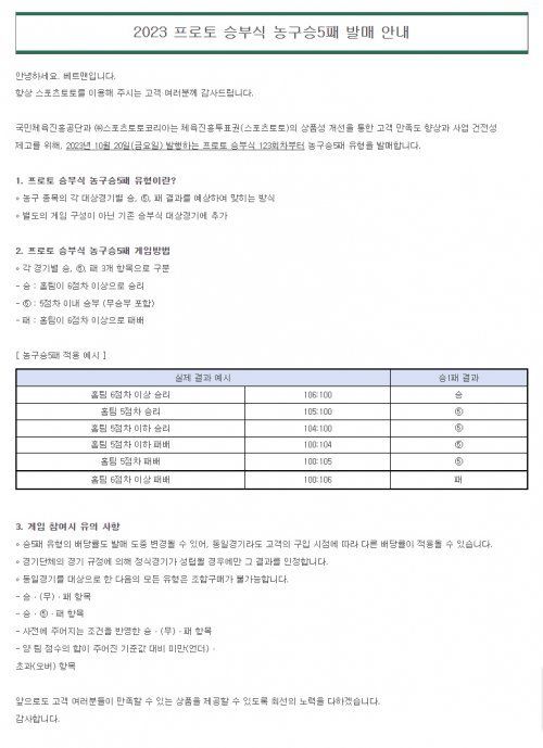 ‘농구승5패’ 게임은 오는 21일(토) 개막하는 2023~2024시즌 국내프로농구(KBL) 경기들을 대상으로 할 예정이며, 고객들은 오는 20일(금) 오후 2시 발매를 개시하는 프로토 승부식 123회차부터 구매가 가능하다.