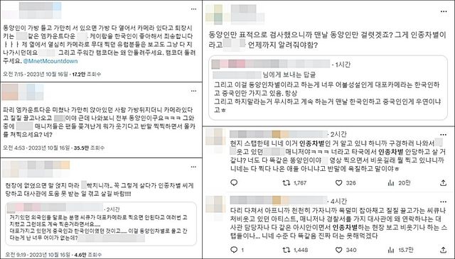실제로 X(구 트위터)에서는 16일 오전 11시(한국 시각) 기준 실시간 인기 트렌드 검색어에 '인종차별', '엠카 프랑스' 등이 올라있다. 온라인에서 확산하고 있는 영상에 따르면 프랑스 현장 시큐리티가 동양인으로 보이는 관객을 바닥에 누인 채 제압하고, 일으켜 세워 끌다시피 이동시킨다. 현장에 있었다고 밝힌 이들은 "가만히 앉아 있던 사람 가방 뒤지더니 카메라 있다고 질질 끌고 나왔다. 나와 보니 전부 동양인이더라", "내 옆에서 열심히 카메라로 무대 찍고 있던 유럽 사람들은 보고도 그냥 지나가더라", "주운 캠코더는 왜 안 돌려주냐", "다리 다쳐서 아프니까 천천히 가자고 했더니 목덜미 잡아채고 질질 끌고 가는 시큐리티나, 비웃고 있던 아티스트 매니저나, 경찰서를 가지 대사관에 왜 연락하냐고 한 대사관 담당자나, 아시아인이면서 인종차별 하는 현장 보고 비웃던 스태프들이나 다 수준 똑같다" 등 주장을 펼쳤다. 특히 이들이 전한 증언 중에는 특정 아이돌 그룹의 매니저로 추정되는 인물이 반발하는 이들을 보면서 비웃고, 동영상을 찍고, 욕설을 뱉었다는 주장도 있었다.