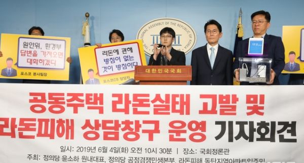 지난 2019년 6월 정의당 윤소하 원내대표와 공정경쟁민생본부, 라돈피해 동탄지역 아파트 입주민들이 포스코 공동주택 라돈실태 고발 및 피해 상담창구 운영 기자회견을 하고 있다. /사진=뉴시스