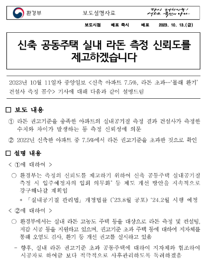 또한 "실내 라돈 고농도 주택 등을 대상으로 라돈 측정 및 컨설팅, 저감 시공 등을 지원하고 있으며, 권고기준 초과 주택 등에 대하여 지자체를 통해 오염도 검사, 환기 등 개선 권고를 실시하고 있다"라며 "향후, 실내 라돈 권고기준 초과 공동주택에 대하여 지자체와 협조하여 시공자로 하여금 보다 적극적으로 사후관리하도록 독려할 것"이라고 밝혔다.