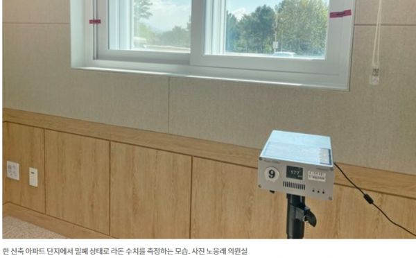 한국아파트신문 등에 따르면 국회 환경노동위원회 소속 노웅래 더불어민주당 의원이 환경부로부터 제출받은 2021년 신축공동주택 2531 가구 중 399 가구(15.7%)에서 1급 발암물질인 라돈이 기준치를 초과한 것으로 나타났으며, ‘2022년 신축 공동주택 라돈 자가측정 결과’에서 2022년 조사한 1925 가구 중 145 가구(7.5%)에서 권고 기준인 148 베크렐(Bq/㎥) 이상의 라돈이 검출됐다.