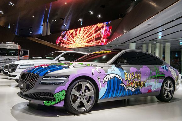 현대차그룹은 갈매기, 광안대교 등 부산의 주요 상징물과 'BUSAN is Ready'(부산은 준비되었습니다)라는 슬로건을 감성적이고 컬러풀한 그라피티 디자인으로 랩핑한 제네시스 G80 기반의 아트카를 17일부터 내달 7일까지 현대 모터스튜디오 고양에 전시한다.