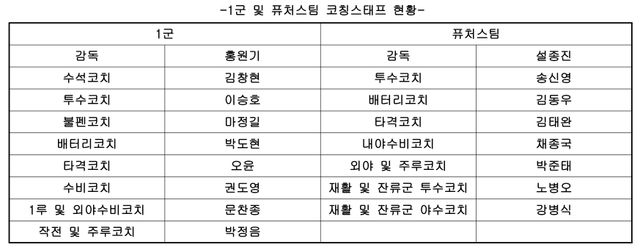 빈자리는 지난해까지 퓨처스팀을 맡았던 코치들로 채운다. 이승호 투수코치와 문찬종 1루 및 외야수비코치, 박정음 작전 및 주루코치가 1군 코치로 새롭게 합류한다.