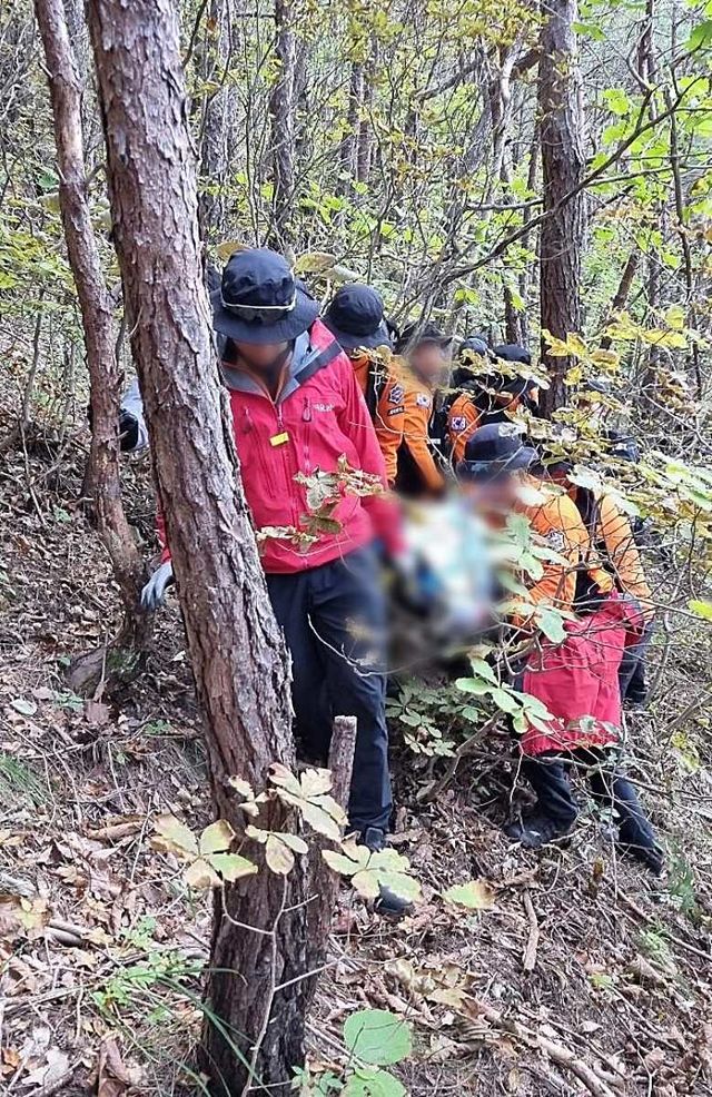 경북 청송군 주왕산면의 한 야산에 송이를 채취하러 갔던 70대 남성이 사후 경직 상태로 발견돼 소방대원들이 구조작업을 펼치고 있다. /경북도소방본부-연합뉴스