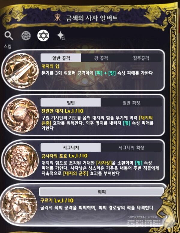이중 금색의 사자 알버트는 둔기를 3회 휘둘러 공격하는 일반 공격과 거대한 사자상을 소환하여 피해를 입히는 시그니처 공격이 있다. 사자상은 성스러운 기운을 내뿜어 주변 적들에게 지속적으로 대지의 군주 효과를 부여한다. 방패를 들어 적을 막는 강공격과 방패로 적을 밀쳐 피해를 입히는 질주 공격이 있다.