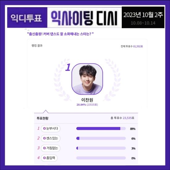 최근 익사이팅디시는 '춤신춤왕! 커버 댄스도 잘 소화해 내는 스타는?'이라는 주제로 투표를 진행했다. 이 투표는 10월 8일부터 10월 14일까지 일주일간 진행됐다.