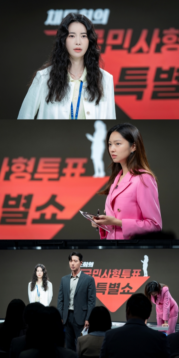 공개된 사진은 ‘채도희의 국민사형투표 특별쇼’ 생방송이 진행 중인 스튜디오에 김무찬, 주현 등 경찰이 등장한 모습을 담고 있다. 앞서 아들 이민수(김권 분)가 개탈과 관련 있음을 알게 된 민지영은 채도희에게 국민사형투표 특별쇼를 제안, 여론을 자신의 편으로 끌어들이려 했다. 채도희 역시 민지영의 제안을 덥석 물었다. 그렇게 두 사람의 욕망이 맞물린 것이 국민사형투표 특별쇼다.
