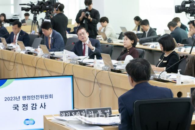 17일 오전 경기도청 다목적회의실에서 열린 2023년 행정안전위원회에서 정우택 국민의힘 의원이 김동연 경기도지사에게 질의하고 있다.(사진=경기도)