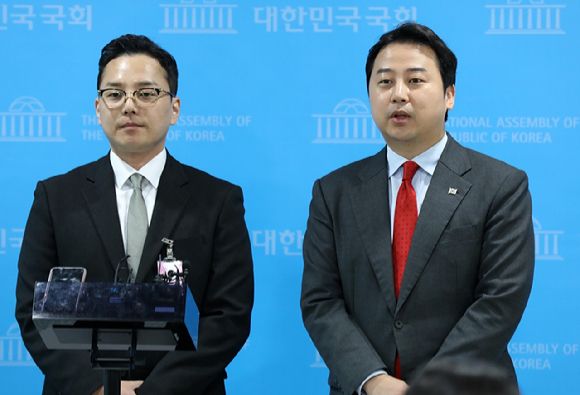장예찬(오른쪽) 국민의힘 청년최고위원과 공익제보자 조명현 씨가 18일 오전 서울 여의도 국회 소통관에서 열린 더불어민주당 이재명 대표 법인카드 공익제보자의 국감 참석 방해 규탄 기자회견을 마치고 취재진 질문에 답변하고 있다. [사진=뉴시스]