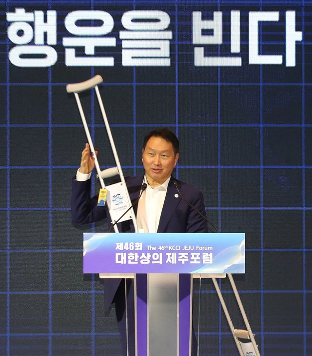 지난 7월 12일 제주 서귀포시 해비치호텔앤드리조트에서 열린 제46회 대한상의 제주포럼 개막식. 대한상공회의소 회장을 맡고 있는 최태원 SK그룹 회장이 자신의 목발을 들어 보이며 이렇게 말했다. 그는 이어 "목발을 짚고 다니다 보니 많은 사람이 좀 불쌍해한다"며 "그 덕분에 동정을 얻어서 엑스포 유치에도 도움이 되고 있다"고 해 웃음을 자아냈다.