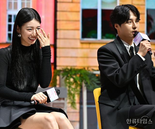 배우 수지, 양세종이 18일 오전 서울 강남구 코엑스 신한카드 아티움에서 열린 넷플릭스 시리즈 '이두나!' 제작발표회에 참석해 취재진의 질문에 답하고 있다.