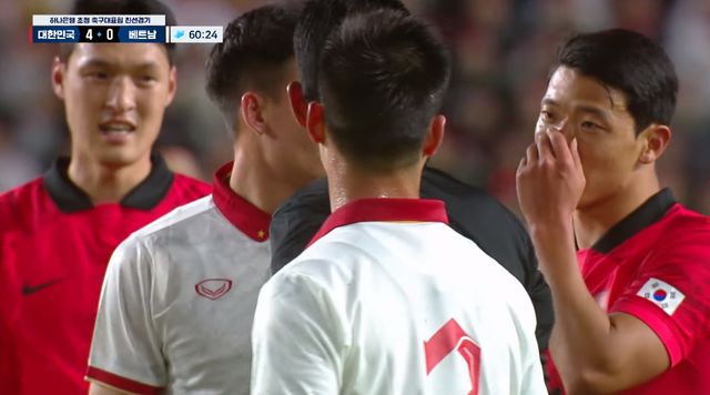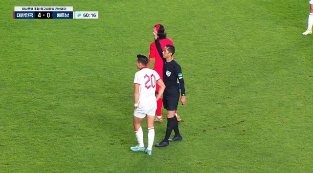 후반 17분 손흥민이 빠르게 전방 압박을 시도하자 이를 막으려 베트남 미드필더 부이 호앙 비엣 안이 태클을 시도했다. 손흥민이 넘어지자 주심은 곧바로 달려가 베트남 선수에게 레드카드를 꺼냈다. 득점 저지 반칙을 범했다고 본 것이다.