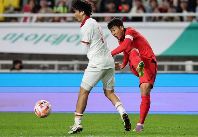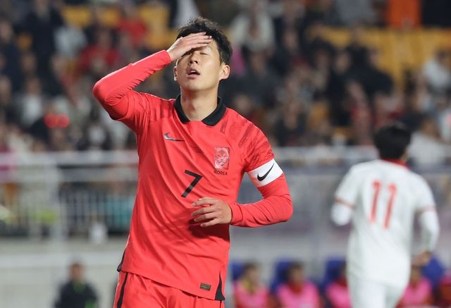 손흥민이 17일 경기 수원시 팔달구 수원월드컵경기장에서 열린 축구 국가대표 평가전 대한민국과 베트남의 경기에서 공격에 실패하자 아쉬워하고 있다. / 뉴스1