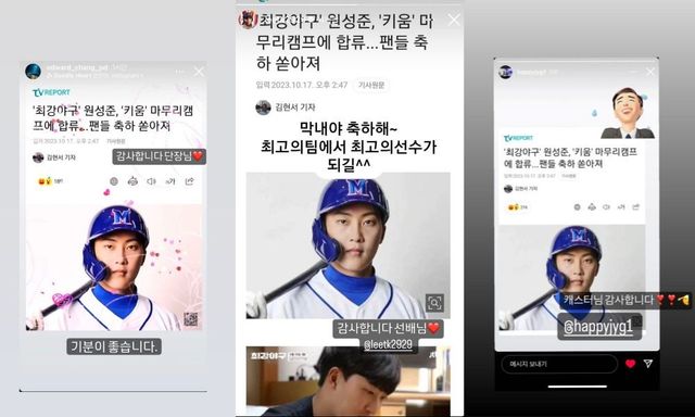 이택근도 마찬가지로 “막내야 축하해. 최고의 팀에서 최고의 선수가 되길”이라고 올렸다. 원성준은 “감사합니다 선배님”이라며 인사를 건넸다. 중계진 정용검 역시 원성준을 축하했다.
