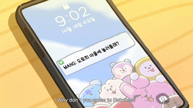이어 도착한 도토희 마을 버스 정류장에서 가족들과 눈물겨운 재회를 마친 망은 BT21 멤버들을 초대하는 메시지를 보내고 1화는 마무리된다.