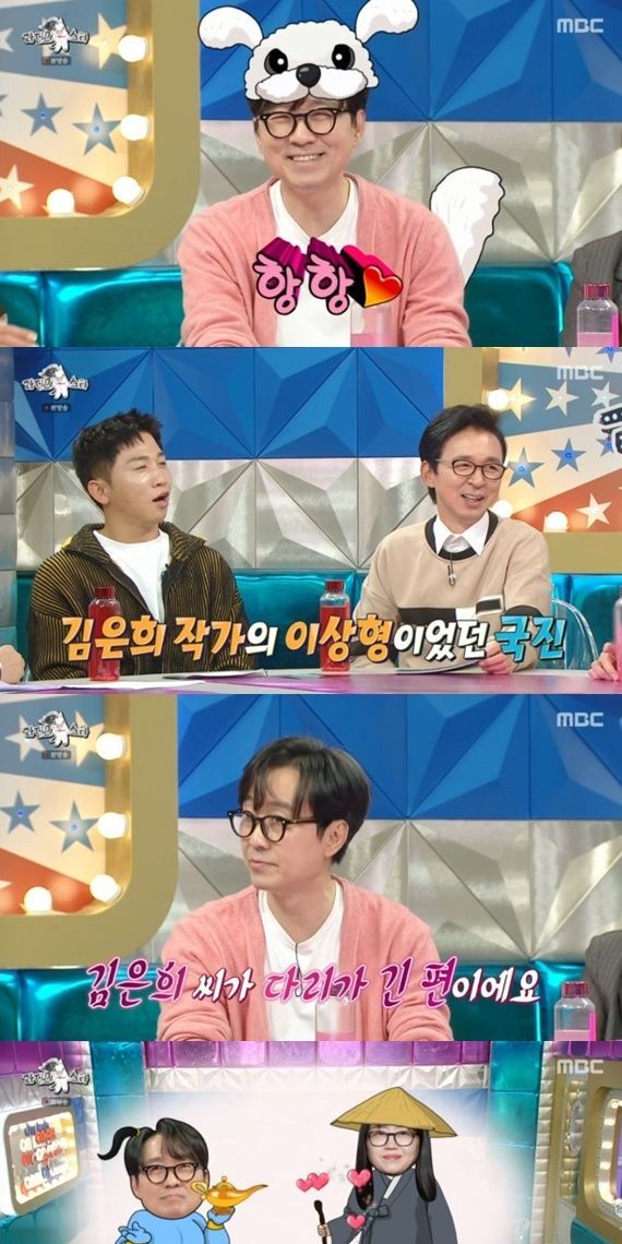 장항준과 함께 출연한 34년 지기 장현성이 장항준이 작가 김은희와 결혼한 이유를 전해 시선을 모았다. 장현성은 "장항준이 선호하는 이상형이 지적이고, 호리호리한 체질에 자기 얘기에 잘 웃어주는 사람이다"라고 밝히며 "장항준은 얘기를 들어주기만 해도 행복해하는 사람이다, 다루기가 어렵지 않다"라고 덧붙였다. 이에 장항준은 "난 이성을 볼 때 몸을 본다, 상체와 하체의 비율"이라고 밝히며 김은희의 다리가 길다고 전해 뜬금없는 아내 자랑으로 웃음을 안겼다. 김은희는 마르고 재밌는 사람을 좋아해 김국진이 이상형이라고.