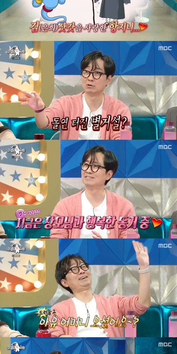 이어 장항준은 김은희와의 별거설에 대해 "아이가 부천에 있는 예고에 진학해 아내 작업실을 부천으로 옮겼다"라고 해명했다. 돌연 터진 별거설에 친척들이 놀라 장항준에게 연락을 했다고. 장항준은 김은희가 딸과 함께 부천에서 거주하고, 현재 본인은 서울에서 장모님과 행복한 한 집 살이 중이라고 근황을 밝혔다.