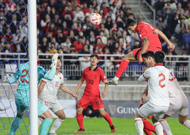 김민재가 17일 경기 수원시 팔달구 수원월드컵경기장에서 열린 축구 국가대표 평가전 대한민국과 베트남의 경기에서 선제골을 넣고 있다. / 뉴스1