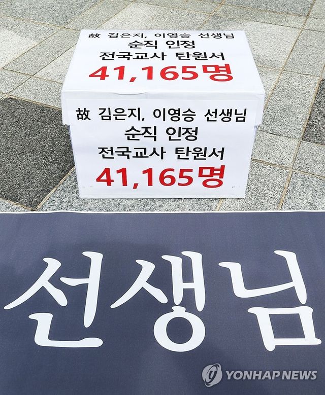 정부세종청사 인사혁신처 앞에 호원초 고 이영승·김은지 교사의 명예 회복을 위한 순직 인정 전국 교사 탄원서가 놓여 있다. / 연합뉴스