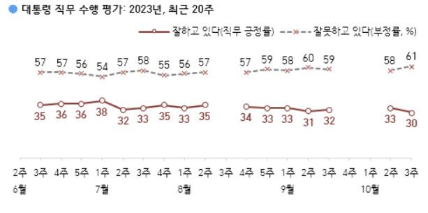 여론조사기관 ‘한국갤럽’이 지난 17~19일 전국 만 18세 이상 1000명에게 ‘윤 대통령이 현재 대통령으로서의 직무를 잘 수행하고 있다고 보는지 잘못 수행하고 있다고 보는지’ 물은 결과, 긍정 평가는 30%, 부정 평가는 61%로 집계됐다. 긍정 평가는 전주 조사 대비 3%포인트 떨어졌으며, 부정 평가는 반대로 3%포인트 올랐다.