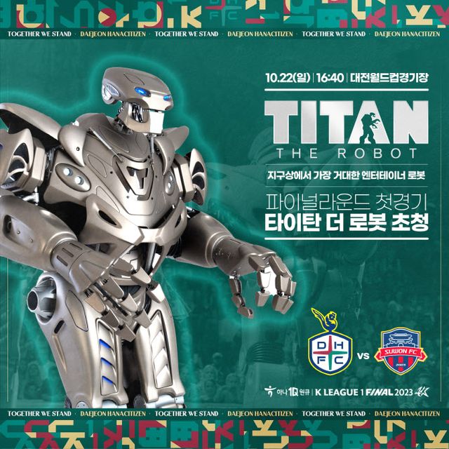 타이탄 더 로봇은 경기 전 대전월드컵경기장 남문 광장에서 퍼포먼스를 비롯해 매치 볼 전달, 서포터즈와 함께하는 응원 TIME, 하프타임 공연 등 다양한 이벤트에 참여할 예정이다.