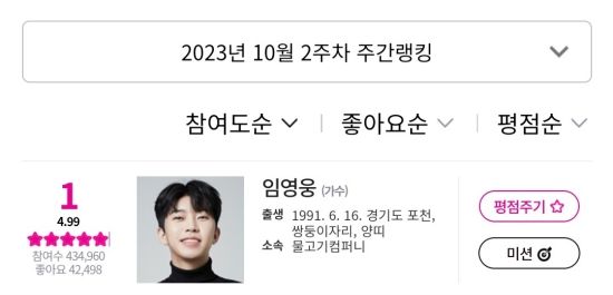 아이돌차트에 따르면 지난 10월 13일부터 10월 19일까지 집계된 평점랭킹에서 임영웅은 43만 4960표를 얻어 최 다득표를 기록했다.