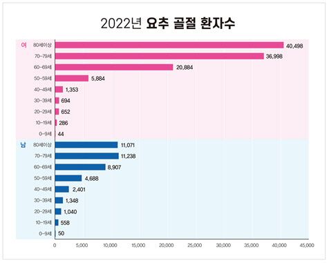 건강보험심시평가원 자료에 따르면 2022년 기준 요추 골절 환자에 있어 70대 경우에 여성 3만6,998명, 남성 1만1,238명으로 여성 환자가 3배 이상 많으며 80대 경우에는 여성이 4만498명, 남성 1만1,071명으로 여성 환자가 4배 이상 많다.