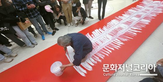 이곳에서는 1970년대 한국 실험 미술을 이끈 선구자로 꼽히는 이건용(81) 작가가 자신의 대표 행위예술 작품인 ‘달팽이 걸음’ 특별전을 선보이기도 했다. 행사 당일 관객 100여 명은 5층 전시실을 가득 채우고 이 작가의 행위예술을 지켜봤다.