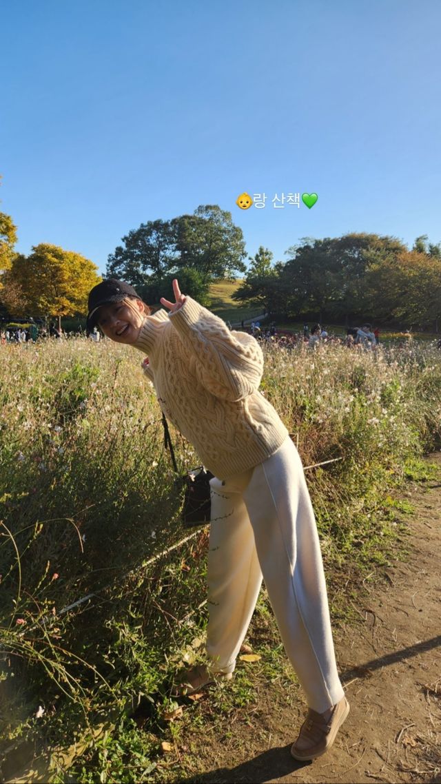 상하의 모두 베이지톤의 편안한 스타일의 패션을 선보인 손연재는 산책 중 가을 분위기를 물씬 즐기며 브이 포즈로 발랄함을 더하고 있다.