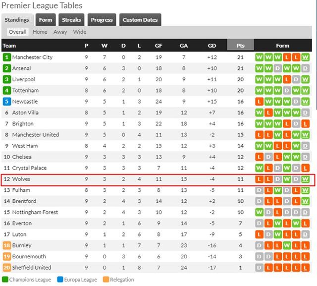 EPL 9라운드 중간 순위. 붉은 네모 안이 울버햄튼 순위./후스코어드닷컴