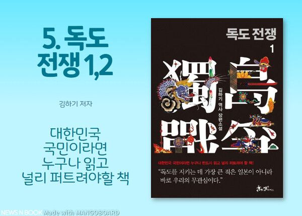 김하기 장편 역사소설 '독도 전쟁'. 조선 숙종 때 업둥이로 자라난 기구한 운명의 독도지킴이 박어둔, 그의 생애를 그린 장편 역사소설이다.