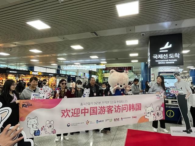 韩国旅游发展局在清州国际机场欢迎到访的中国游客。【图片提供 韩联社】