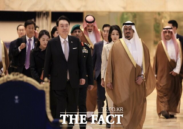 윤 대통령 부부가 내리자, 사우디아라비아 측은 예포 21발을 발사하기도 했다. 바닥에는 보라색 카펫이 깔렸고 의장대도 도열했다. 모하마드 빈 압둘라만 빈 압둘아지즈 부주지사, 파이잘 빈 압둘아지즈 알 므크린 시장, 사미 알사드한 주한 사우디 대사 등이 윤 대통령 부부를 영접했다.
