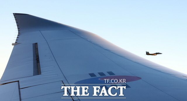 사우디아라비아를 국빈 방문하는 윤석열 대통령과 부인 김건희 여사가 탑승한 공군 1호기가 21일(현지시간) 사우디 공군 전투기의 호위를 받고 있다. /뉴시스