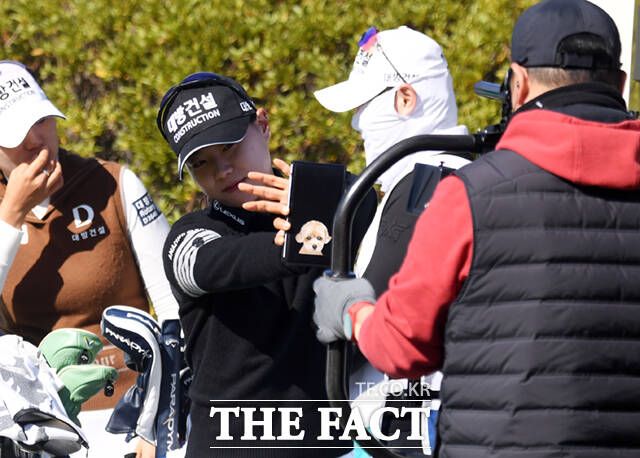 이소미가 22일 경기 양주 레이크우드CC에서 열린 상상인·한국경제 TV오픈 2023 최종라운드 경기에 참가해 1번홀 티샷에 앞서 방송카메라에 자신의 야디지북에 그려진 강아지 그림을 공개하고 있다. /양주=이새롬 기자