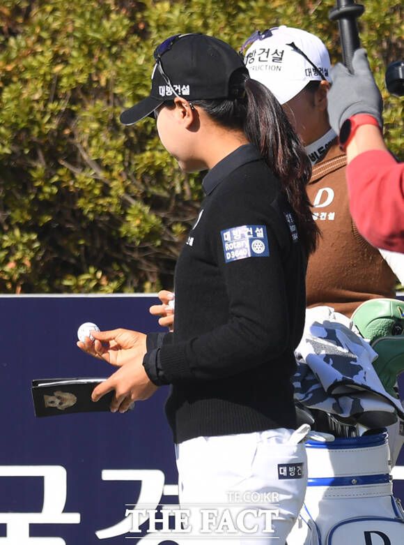 [더팩트ㅣ양주=이새롬 기자] 이소미가 22일 경기 양주 레이크우드CC에서 열린 상상인·한국경제 TV오픈 2023 최종라운드 경기에 참가해 1번홀 티샷에 앞서 방송카메라에 자신의 야디지북에 그려진 강아지 그림을 공개하고 있다.