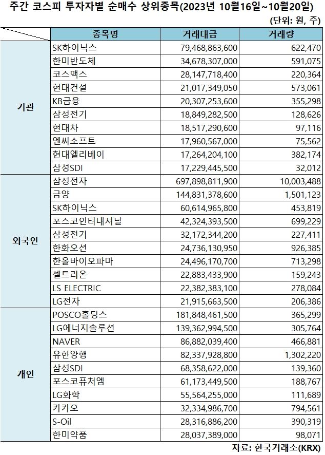 기관 'SK하이닉스'·외인 '삼성전자'·개인 'POSCO홀딩스' 1위 [주간 코스피 순매수- 10월16일~10월20일]