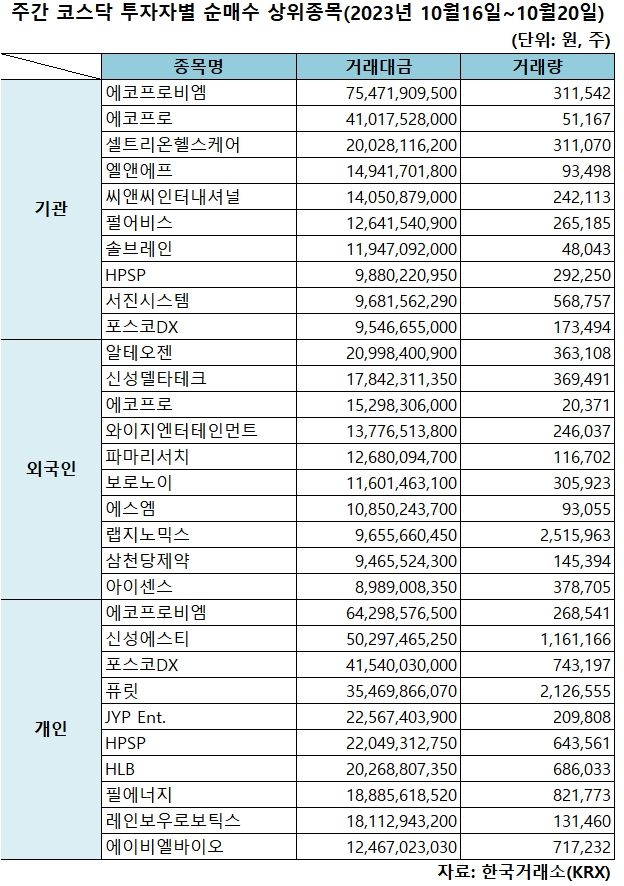 기관 '에코프로비엠'·외인 '알테오젠'·개인 '에코프로비엠' 1위 [주간 코스닥 순매수- 10월16일~10월20일]