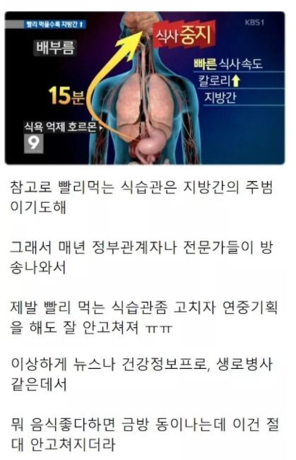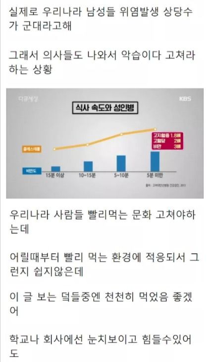 바로 음식을 거의 마시듯이 먹는 한국인들의 빠른 식사 속도가 고쳐야 할 버릇이라고 합니다. 음식을 빨리 먹는게 안 좋은 건 알았지만 이렇게 안 좋은지는 몰랐네요.