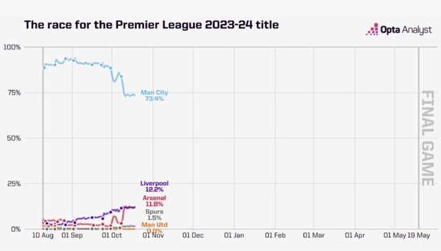 프리미어리그도 "지금까지 8라운드에서 선두를 달렸던 31개 팀들 중 흥미롭게도 12팀이 프리미어리그 트로피를 들어올렸다. 즉 우승 확률은 39%이다"라고 전하며 토트넘의 우승 가능성을 언급하기도 했다. 하지만 옵타는 프리미어리그의 예상보다 훨씬 낮은 수준으로 토트넘의 우승 확률을 점쳤다.
