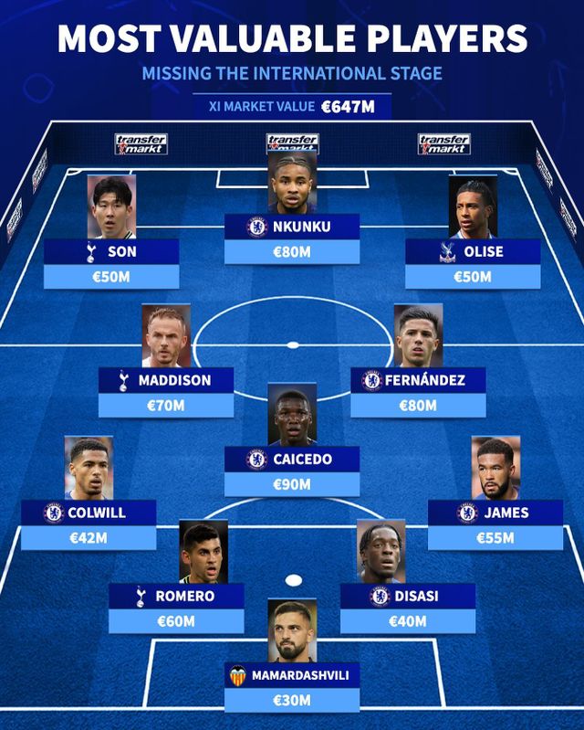 유럽축구 이적시장 전문 매체 트랜스퍼 마크트는 22일(한국시간) "인터내셔널 매치를 놓치게 된 선수들"이라며 올 시즌 유럽축구연맹(UEFA) 챔피언스리그를 비롯해 UEFA 주관 대회에 나서지 못하는 선수들의 시장 가치 베스트 11을 공개했다.