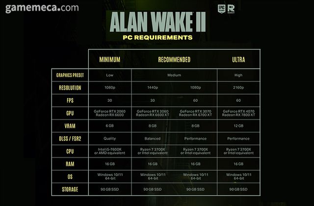 오는 27일 출시되는 ‘앨런 웨이크 2(Alan Wake 2)’ 사양이 공개됐다. 그런데 요구 스펙이 상당히 높아 최적화에 대한 우려가 나온다.