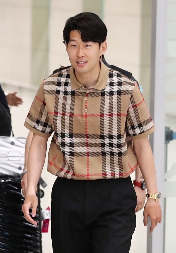 버버리 폴로 셔츠와 검은색 와이드 바지 입고 등장한 손흥민 / 뉴스1