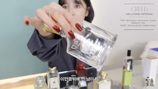 얼마 남지 않은 향수를 아껴 쓰고 있을 만큼 그녀가 애정하는 크리드의 밀레지움 임페리얼. 지인의 집에 방문했을 때 처음 맡아본 향으로 집 전체에 풍기는 좋은 향에 반해 자신도 구매해 사용하는 중이라고 해요. 씨 솔트와 프루티한 향을 시작으로 바다향과 머스크, 우디를 품고 있는데, 그래서인지 잔향이 특히 유니크하고 기억에 남는다고 해요.